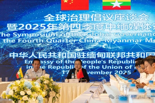 2025年11月17日,中國駐緬甸使館在仰光舉辦全球治理倡議座談會暨2025年度第四季度中緬媒體茶話會,中國駐緬甸大使馬珈、緬宣傳部長貌貌翁和中緬30余家媒體、智庫、學者代表約160人出席,鄭志宏公參主持。