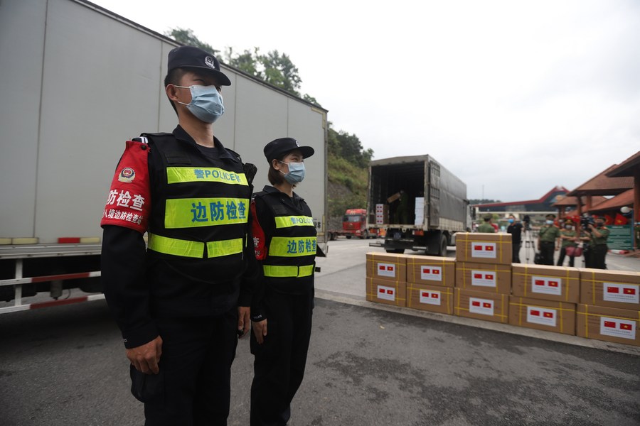 Police officers are seen in front of trucks carrying COVID-19 prevention and control materials at a border crossing between China and Vietnam, on May 12, 2020. (Chinese Embassy to Vietnam/Handout via Xinhua)