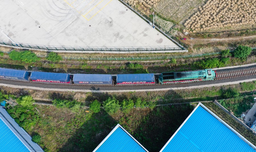 Aerial photo taken on May 26, 2020 shows a China-Europe freight train carrying mechanical accessories, fabrics and solar photovoltaic products bound for Hanoi of Vietnam leaving a logistic hub in Hai'an, east China's Jiangsu Province. (Xinhua/Ji Chunpeng)