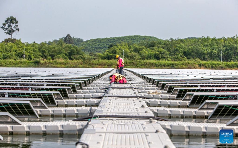 Staff members check the cable of the solar floating project in Rayong, Thailand, April 11, 2022. The solar floating project in Rayong province was constructed by Banpu Company of Thailand with support of Chinese technology company Huawei. (Xinhua/Wang Teng)
