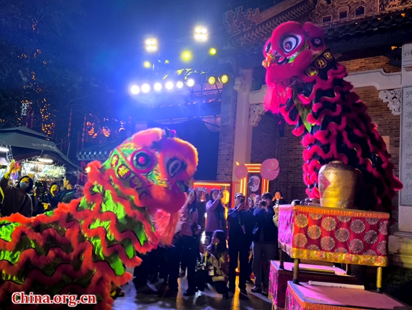 Attendees of the Global Mayors Dialogue event enjoy a lion dance performance in Nanning's Sanjie Liangxiang historical district, south China's Guangxi Zhuang autonomous region, Jan. 15, 2025.